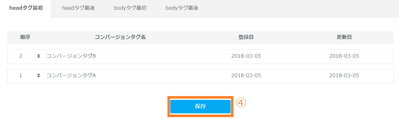 複数のコンバージョンタグを登録した際、設置順設定でタグを読み込む順番を設定します。
