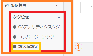 ①画面左のメニューバーより > 【販促管理】 > 【タグ管理】 > 【設置順設定】をクリックしてください。