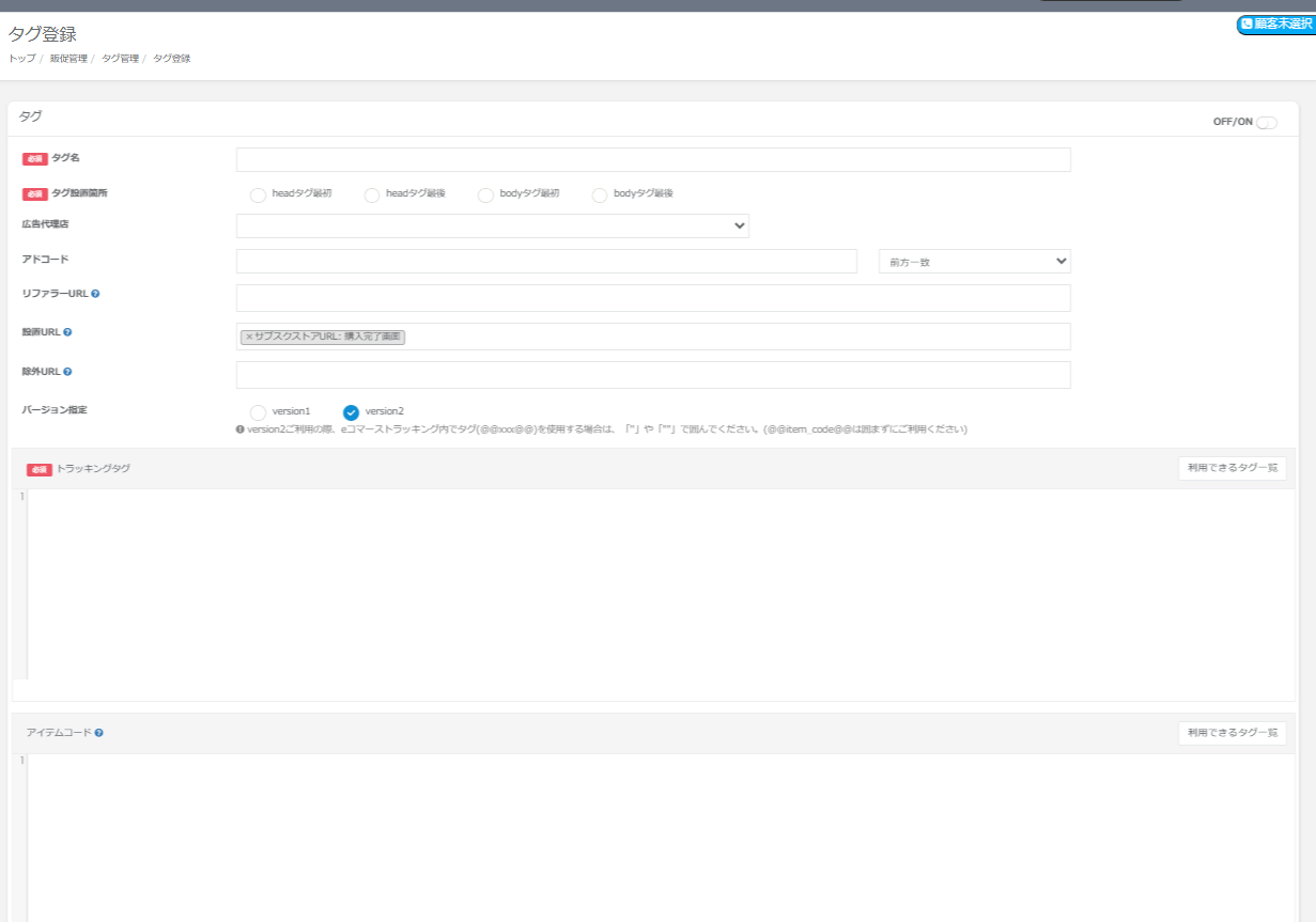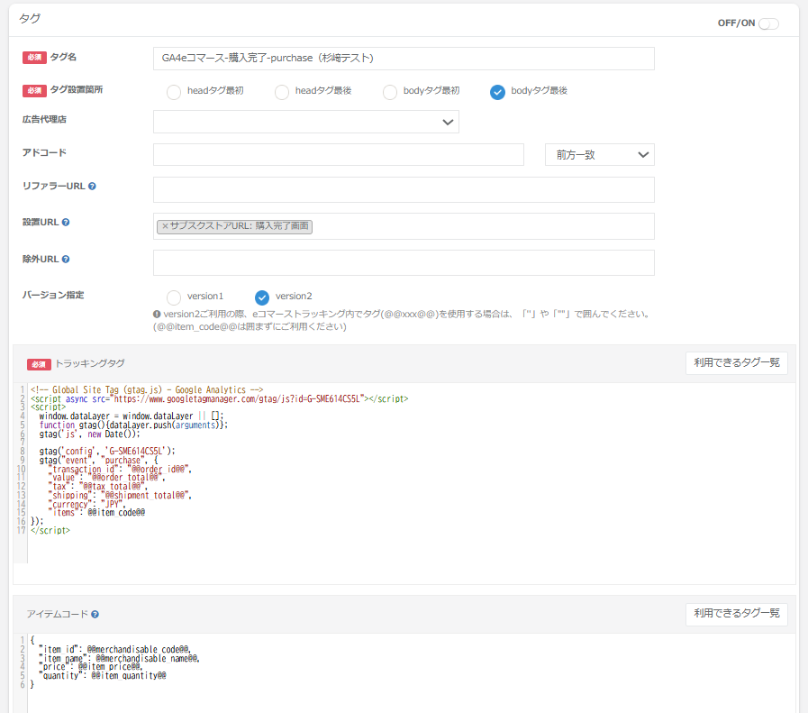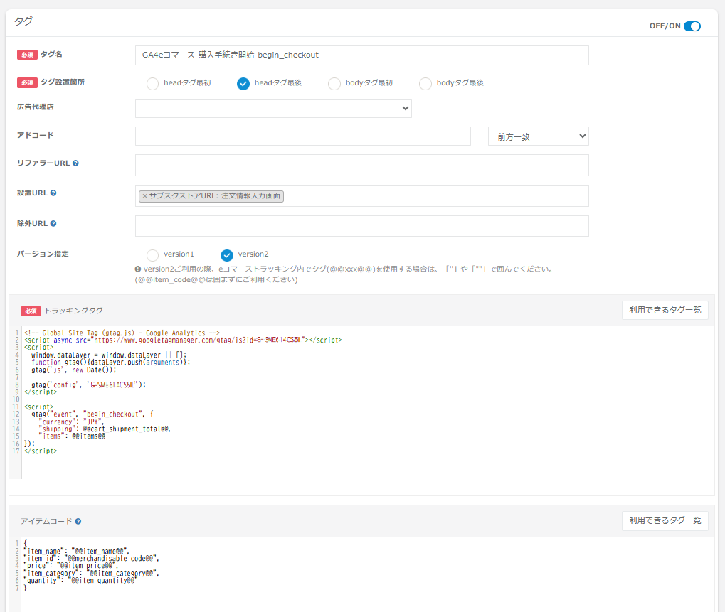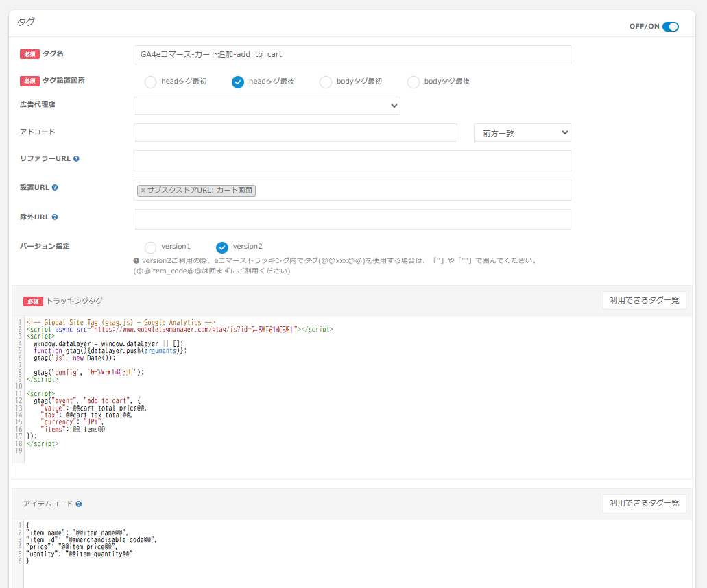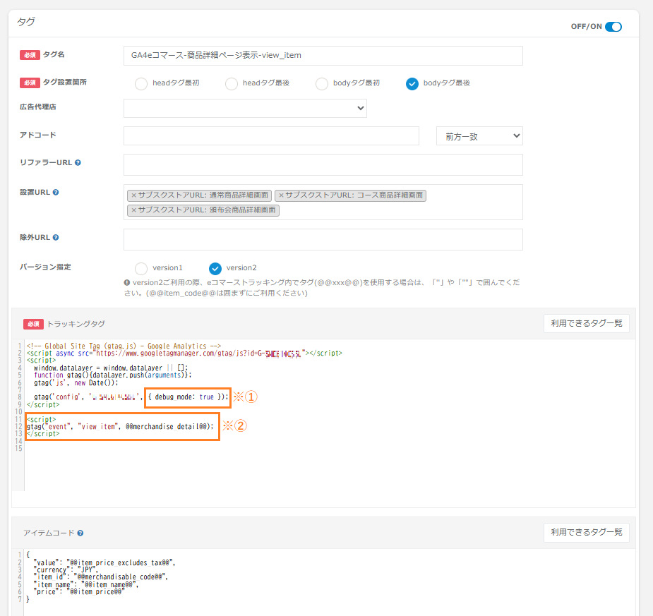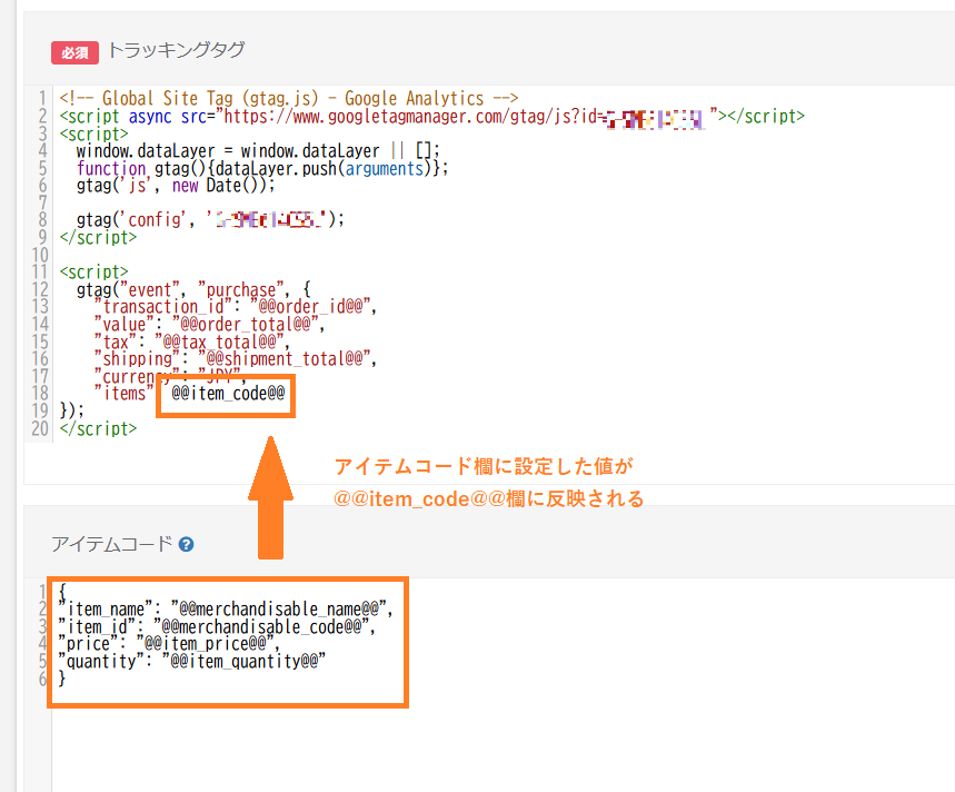 ④アイテムコード欄は、トラッキングタグ欄に下記のタグを入力した場合にのみ設定が必要となります。