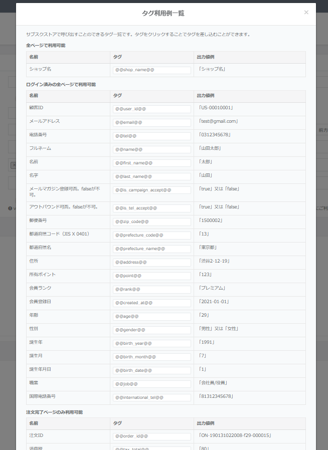 ③「利用できるタグ一覧」では、顧客・注文ごとに異なる情報を取得するためのタグをご確認いただけます。