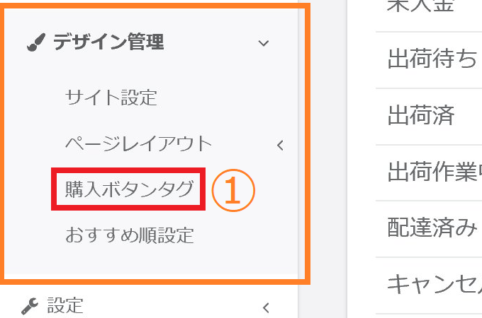 ①画面左のメニューバーより【デザイン管理】>【購入ボタンタグ】をクリックします。