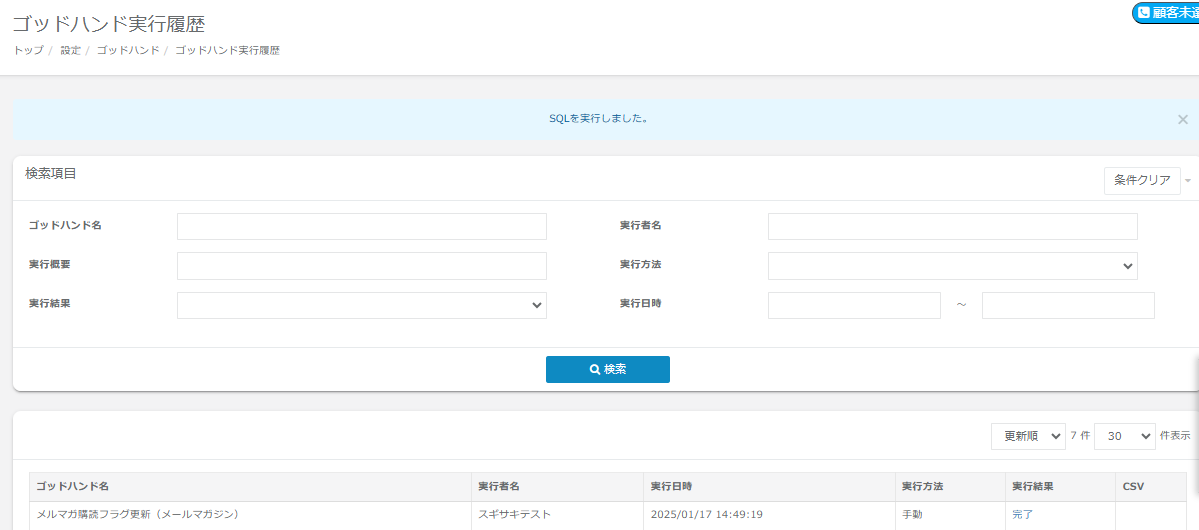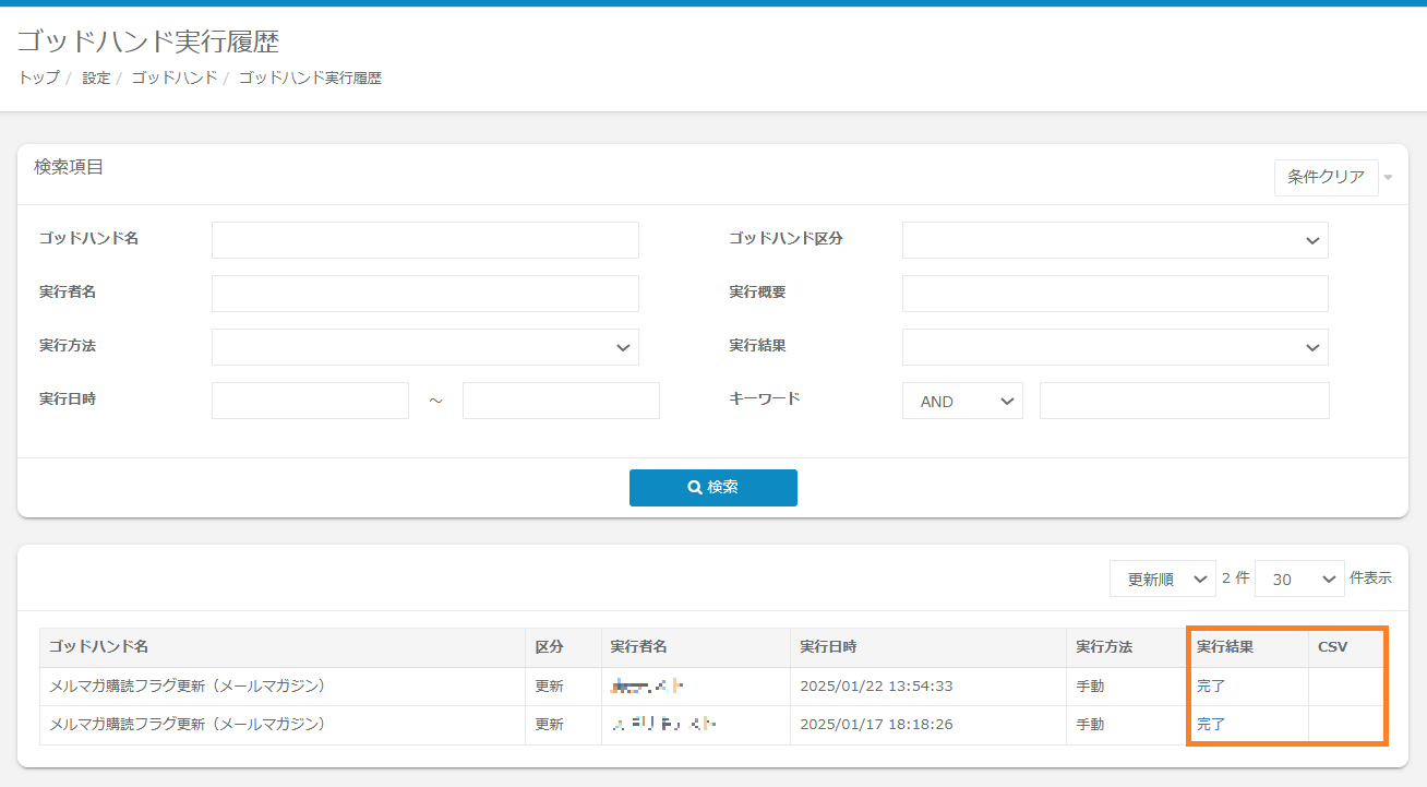 ゴッドハンド実行履歴では、実行したゴッドハンドの実行結果の確認とCSVを出力することが可能です。