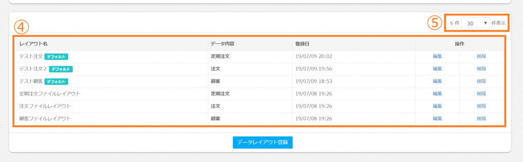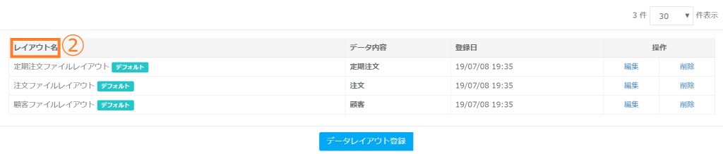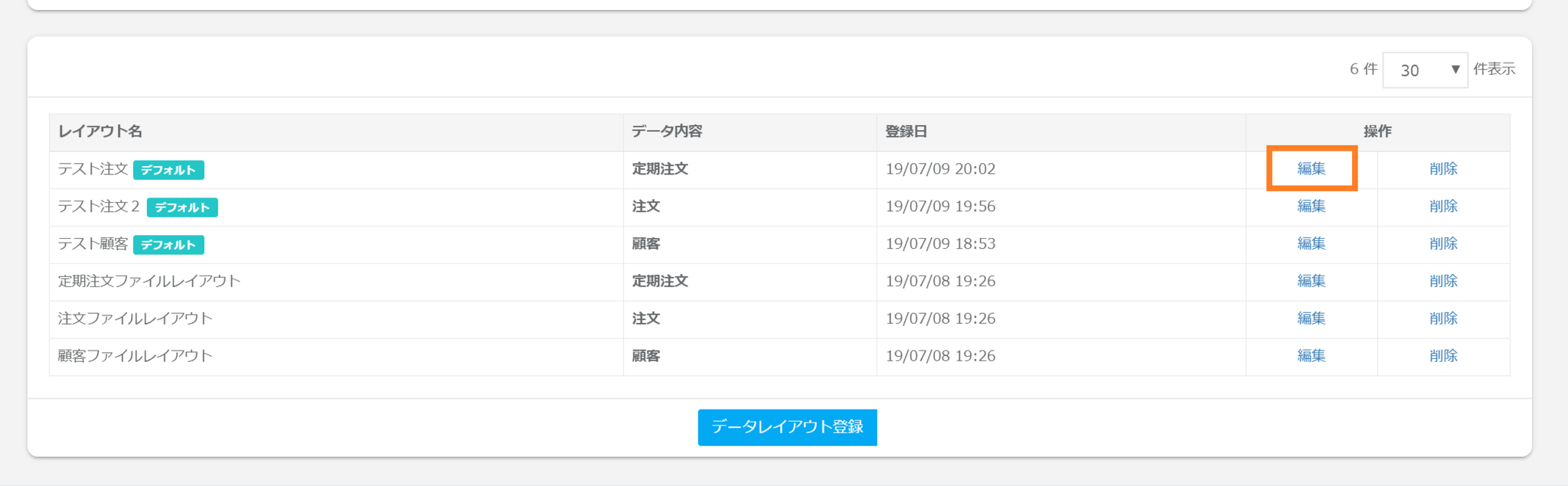 ①各ファイルレイアウトごとに「編集」リンクがありますので、クリックしてください。