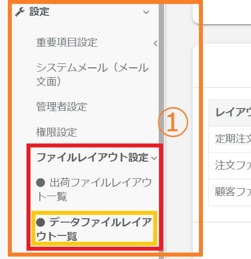 ①画面左のメニューバーより【設定】 > 【ファイルレイアウト設定】 > 【データファイルレイアウト一覧】をクリックしてください。