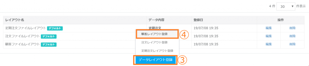 ③各種データレイアウトの新規登録方法は同様となるため、こちらでは「顧客レイアウト登録」を例に設定をご案内いたします。