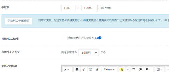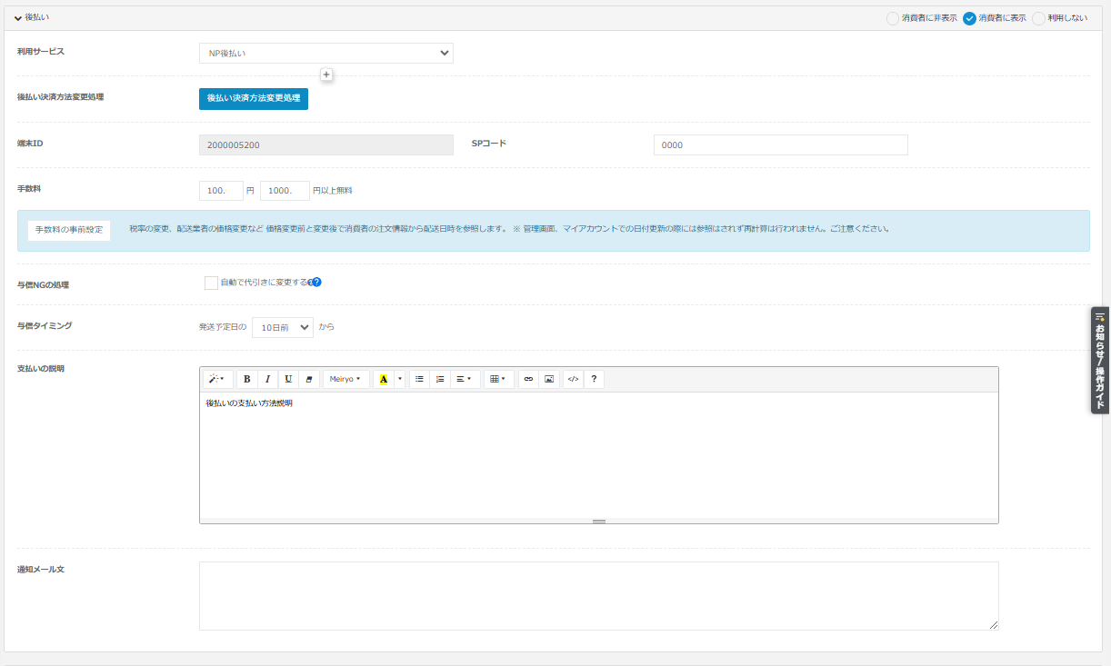 | 支払い方法の説明 | カート画面の支払い方法選択ページに説明が表示されます。こちらで後払いの説明や注意事項をご設定ください。 |