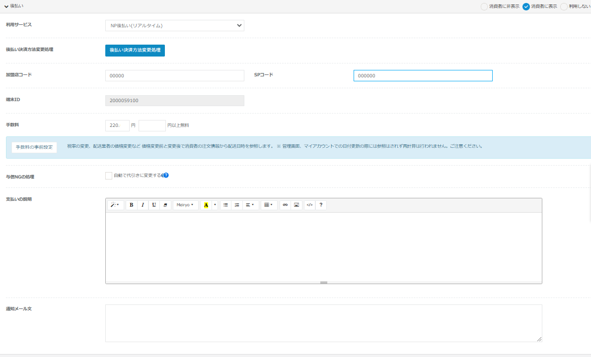 ※NP後払いリアルタイム与信 へと切り替える際、「利用しない」に自動で切り替わります。「消費者に表示」「消費者に非表示」のどちらかをご選択ください。手数料や支払いの説明欄はリセットされるため、再度設定してください。