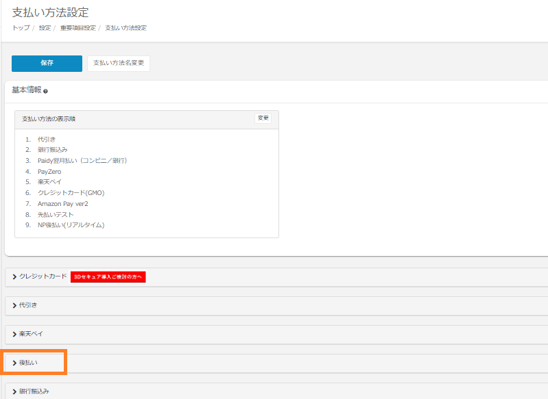 【設定】>【重要項目設定】>【支払方法設定】>【後払い】 にて、後払い決済の切り替えを行います。
