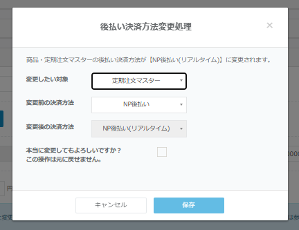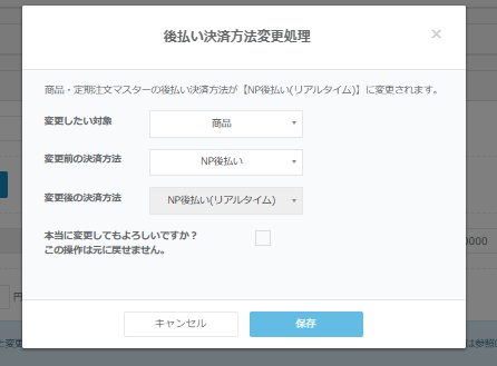 「確認」が表示されますのでOKをクリックし、保存をクリック頂きますと、NP後払い(リアルタイム)へと切り替わります。