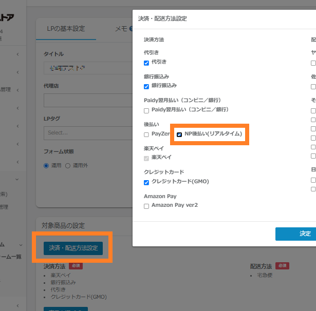 該当LP一体型フォームの編集>決済・配送方法設定にて、【NP後払い(リアルタイム)】にチェックを入れ、決定>保存をします。