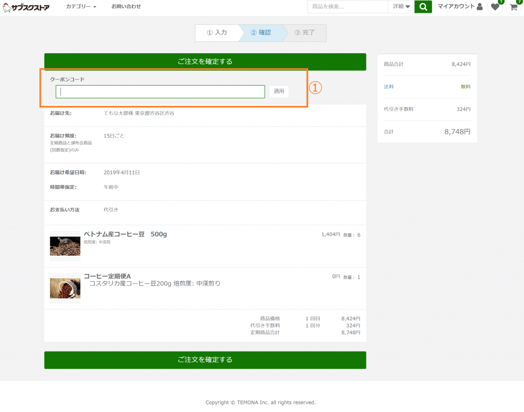 ①ご購入者様がご注文の際にクーポンを使用する場合、「ご注文内容の確認」画面でクーポンコードを入力し、「適用」ボタンをクリックします。