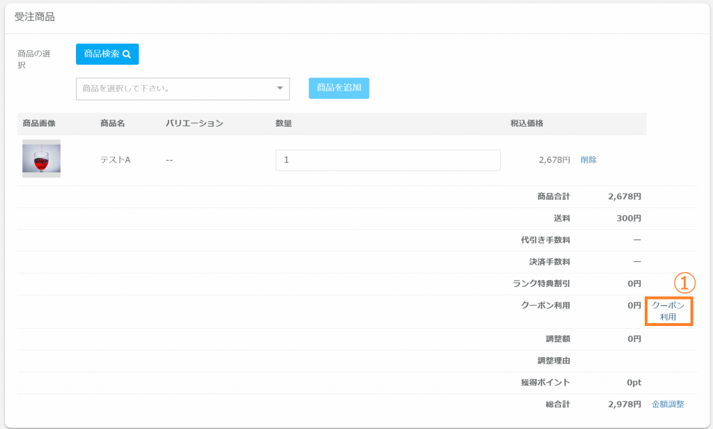 ①受注登録画面の「クーポン利用」リンクをクリックします。