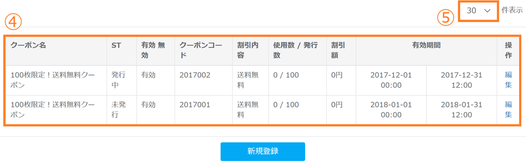 ⑤「クーポン編集」「削除」リンクからクーポンの変更や削除が可能です。