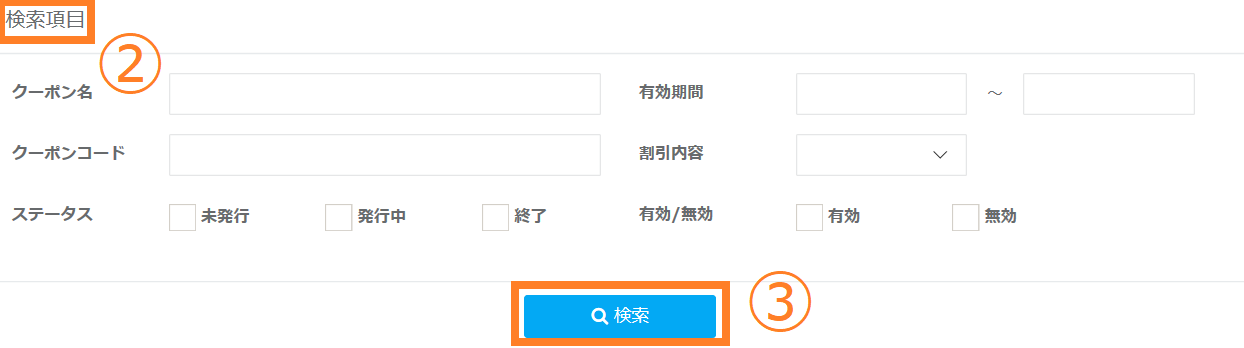 | クーポン名 | 検索対象のクーポン名を指定してください。 ※部分一致での検索も可能です。 |