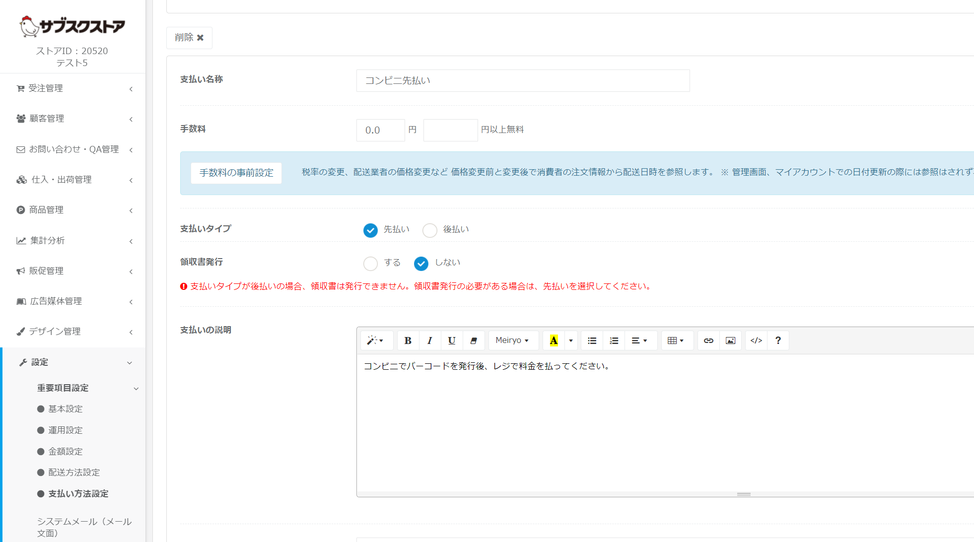 重要項目設定>支払い方法設定