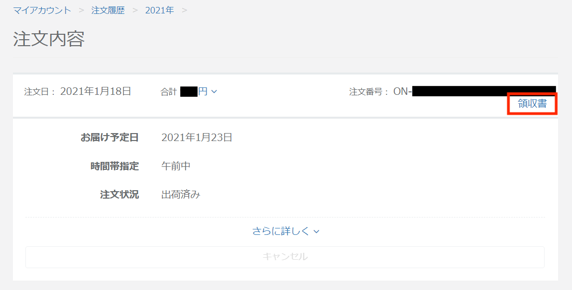- 注文履歴右上、領収書ボタンをクリック