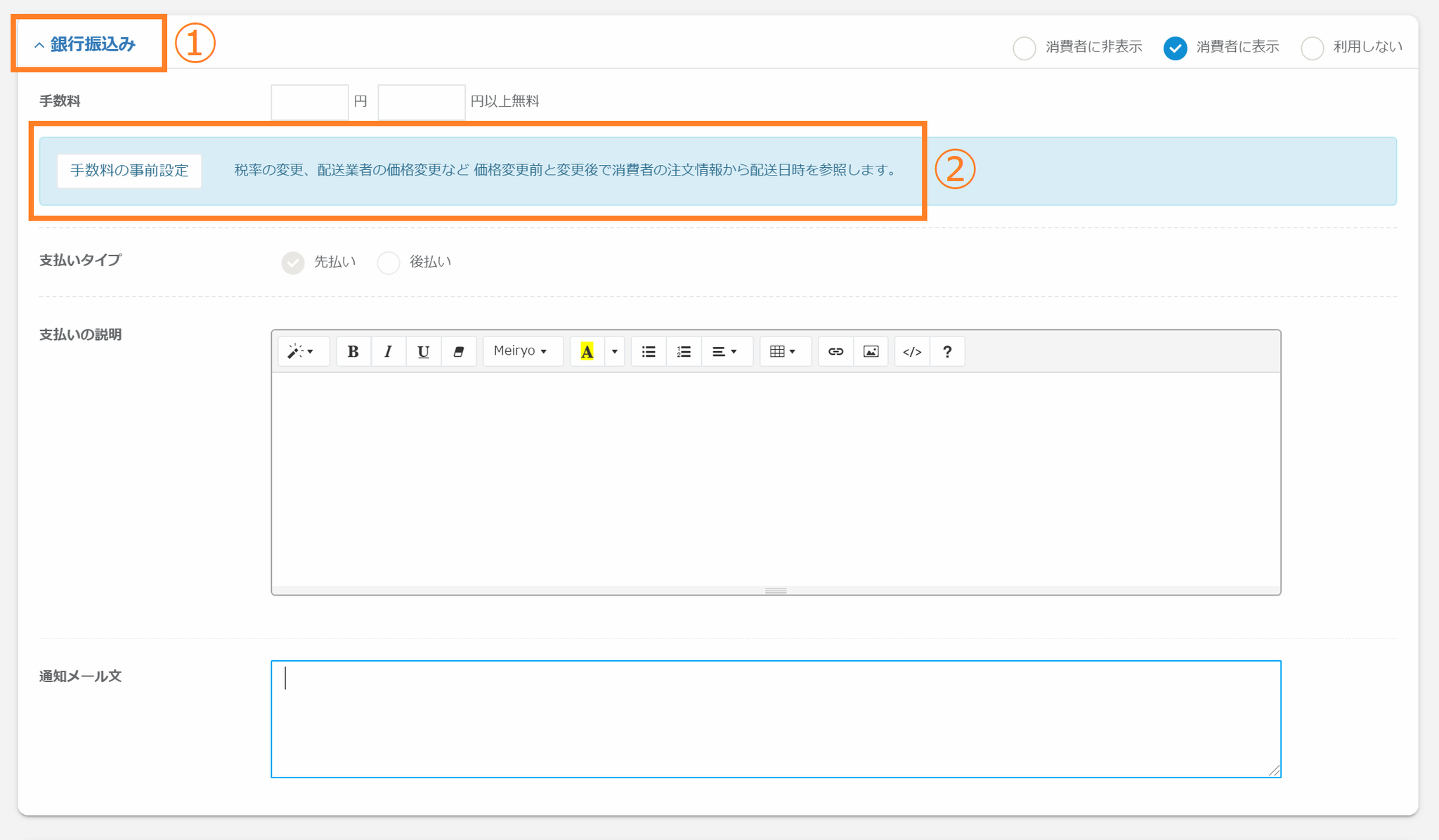 | 通知メール文 | 銀行振込みで購入されたお客様向けに通知内容がある場合にご入力ください。システムメール設定にて「@@message_each_payment_method@@」を入れていただくと、設定内容が銀行振込み利用者のメール文に反映されます。 |
