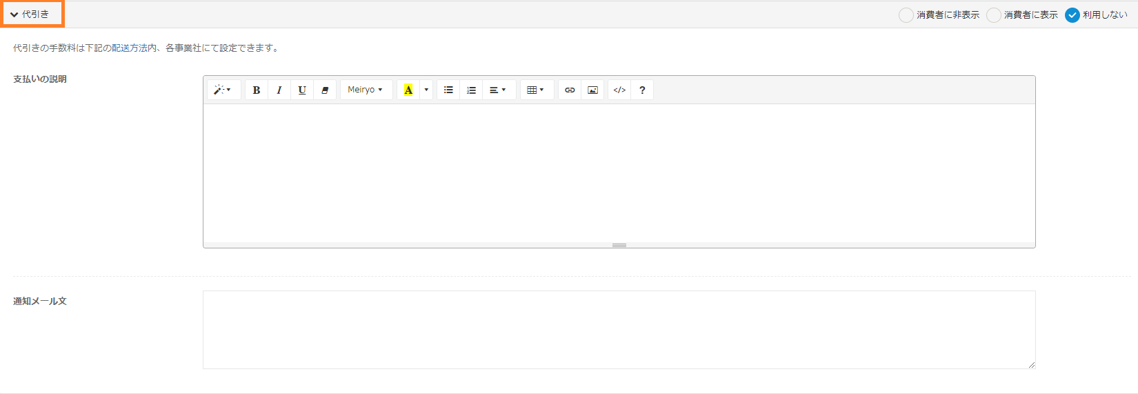 | 利用可否 | 代引きの利用可否を指定します。 ・消費者に非表示:管理画面でのみ利用できます。 ・消費者に表示:管理画面、カート画面で利用できます。 ・利用しない:代引きを利用しません。 |