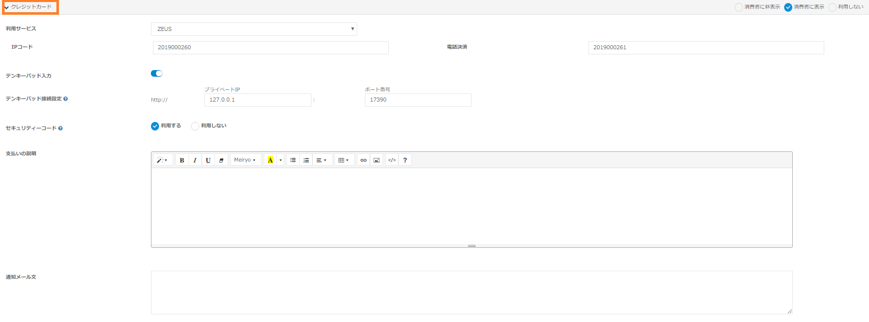 | 共通 | 利用可否 | クレジットカードの利用可否を指定します。 ・消費者に非表示:管理画面でのみ利用できます。 ・消費者に表示:管理画面、カート画面で利用できます。 ・利用しない:クレジットカードを利用しません。 |