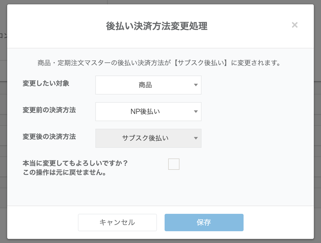③「後払い決済方法変更処理」では、商品管理で設定されている後払い方法と、後払いが選択されている定期注文マスターの後払い決済方法を一括変更することが可能です。