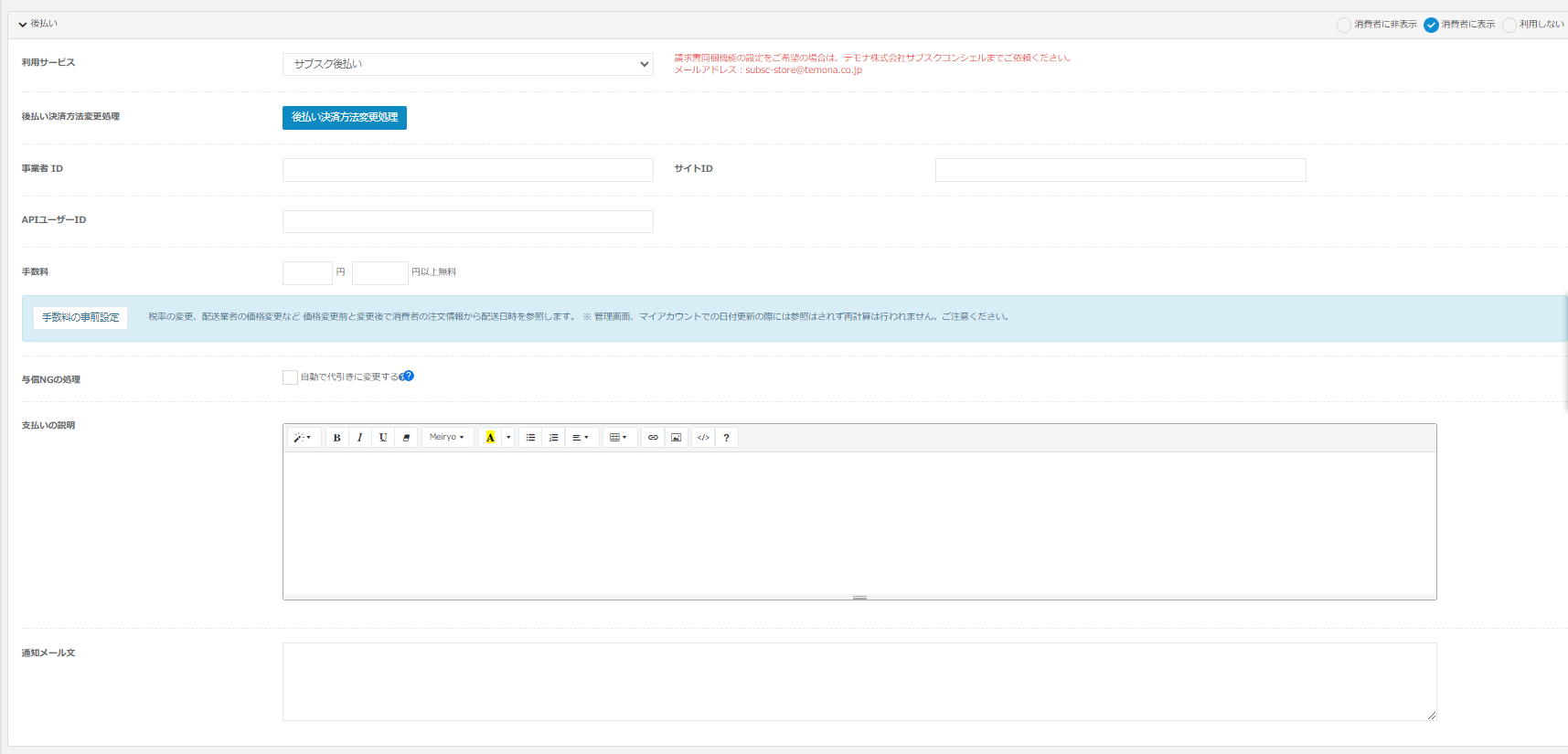 | 共通 | 利用可否 | 後払いの利用可否を指定します。 ・消費者に非表示:管理画面でのみ利用できます。 ・消費者に表示:管理画面、カート画面で利用できます。 ・利用しない:後払いを利用しません。 |