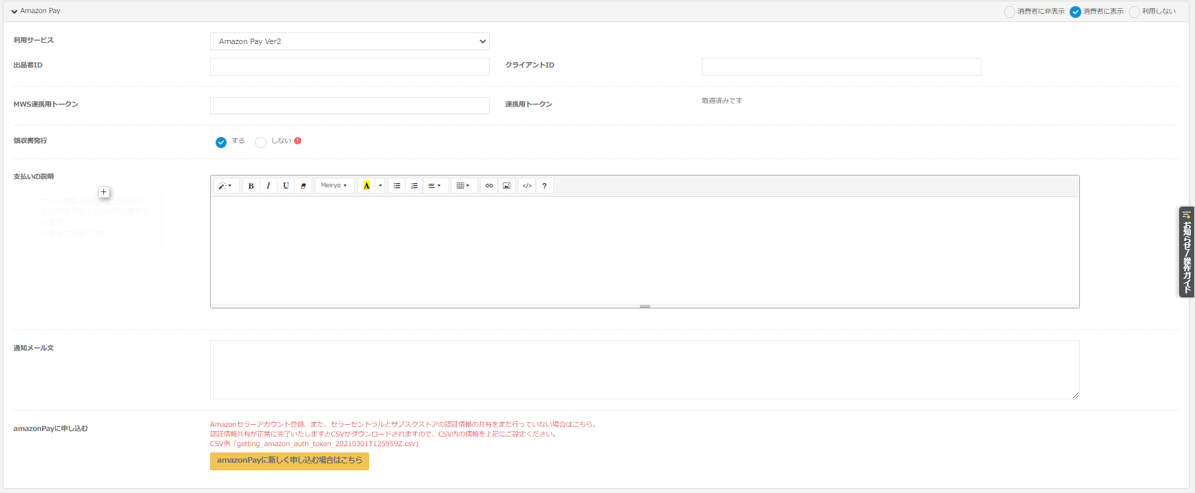 | 利用可否 | Amazon Pay の利用可否を指定します。 ・消費者に非表示:管理画面でのみ利用できます。 ・消費者に表示:管理画面、カート画面で利用できます。 ・利用しない:Amazon Pay を利用しません。 |