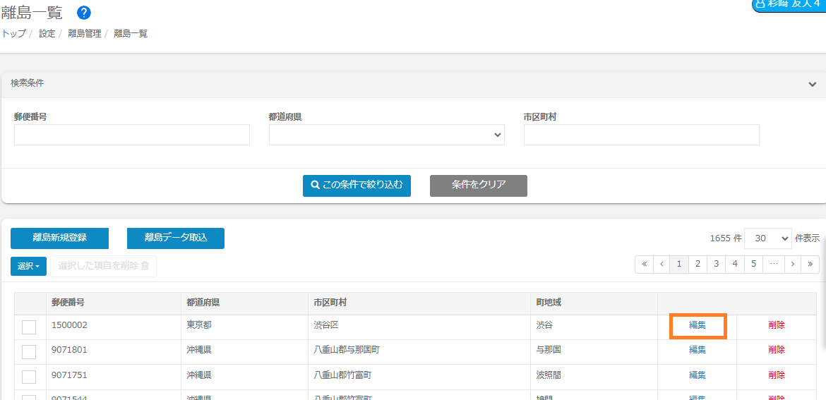 ①編集したい離島データの「編集」ボタンをクリックします。