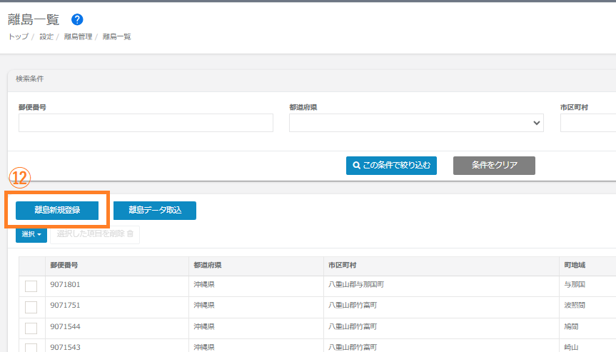 ⑪離島データが正しく取り込まれた場合、離島一覧にデータが表示されます。