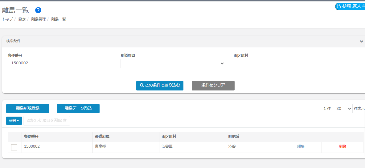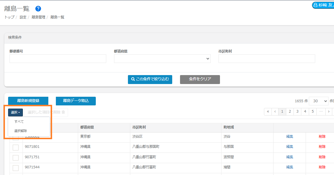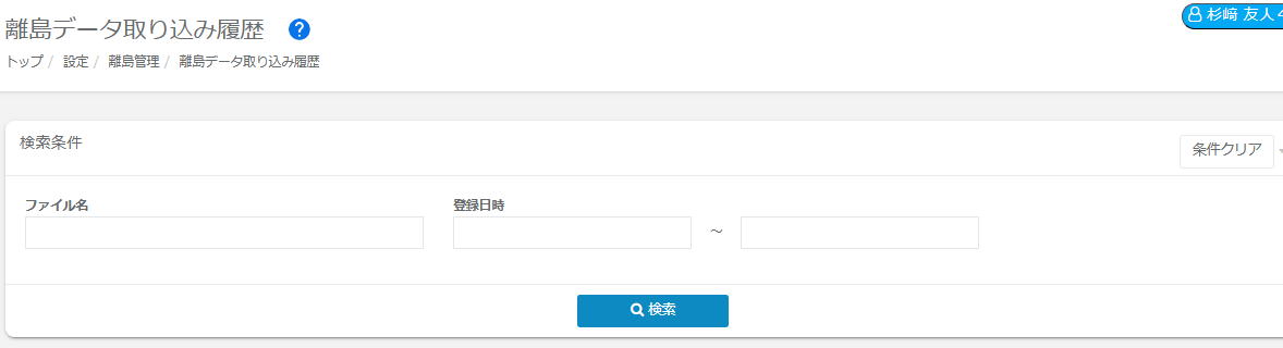 ②離島データ取込にご利用になった「ファイル名」、または登録日時から検索が可能です。