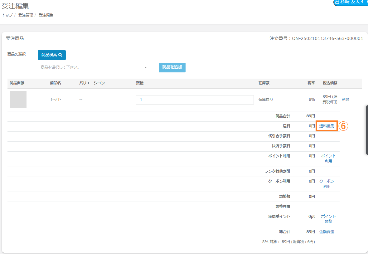 ⑥送料を変更する場合、「送料編集」をクリックします。
