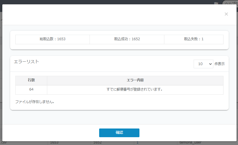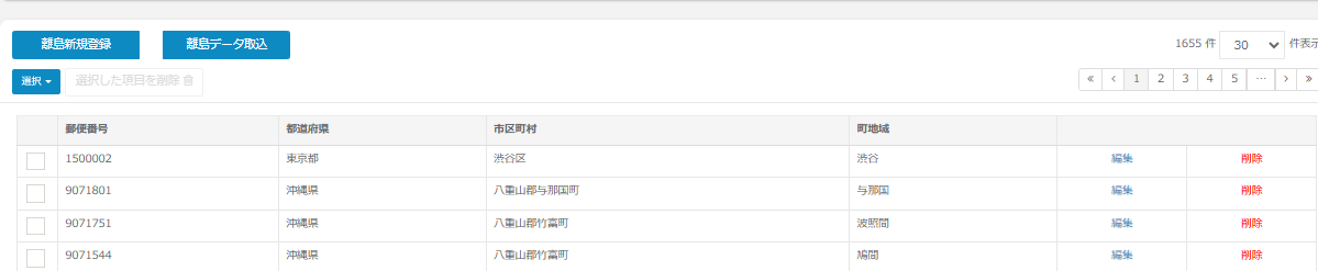 | すでに郵便番号が登録されています。 | 離島一覧に既に登録されている住所が取り込まれた場合に表示されます。 |