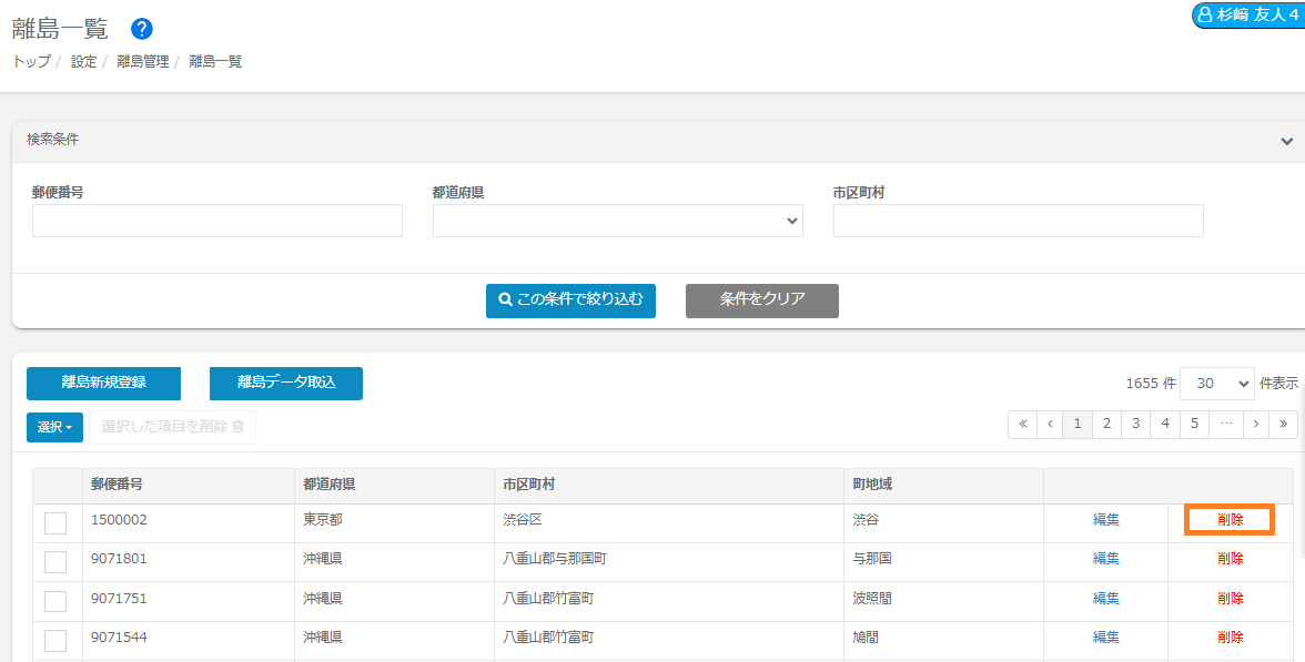 ①削除したい離島データの「削除」ボタンをクリックします。