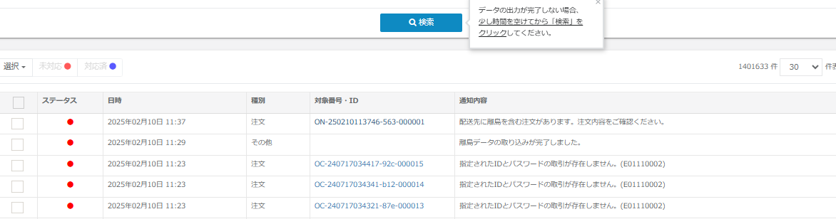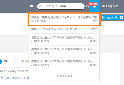 本機能にて離島として設定した地域から注文が入った際、自動で出荷停止処理となり、通知ログに通知が入るようになります。