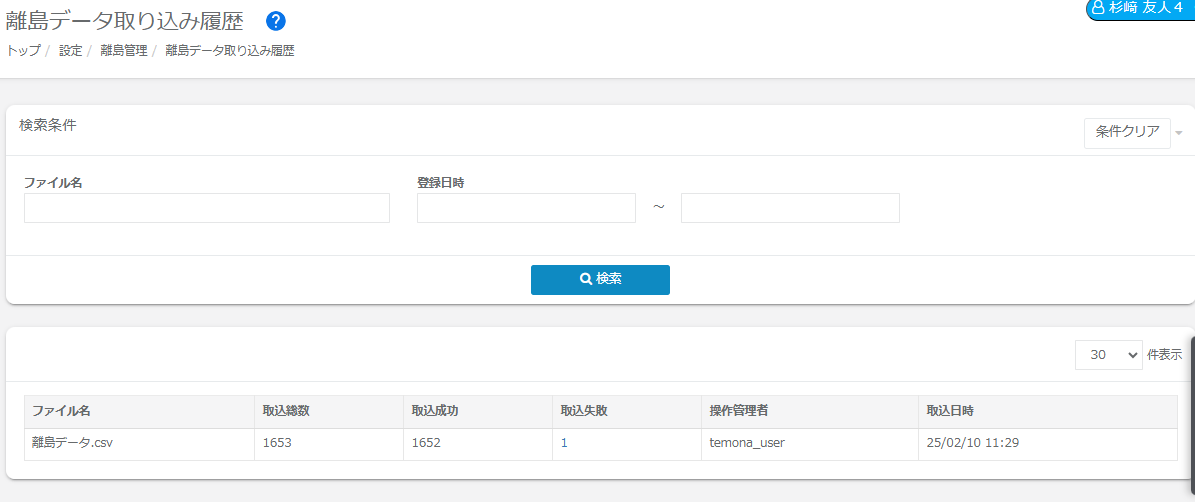 離島データ取り込み履歴では、CSVで取り込んだ履歴をご確認いただけます。