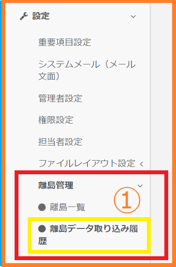 ①画面左のメニューバーより 【設定】>【離島管理】>【離島データ取り込み履歴】をクリックします。