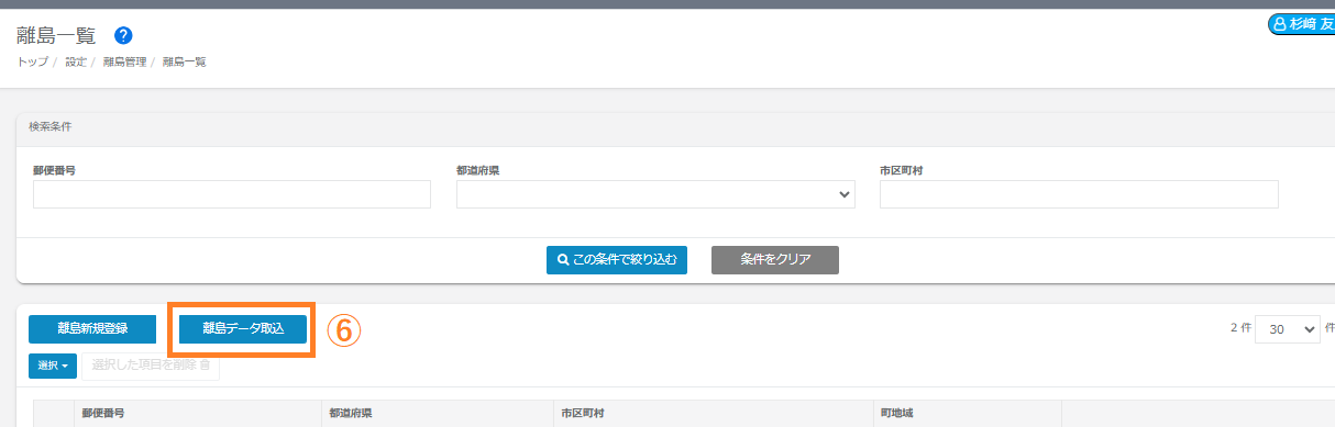 ⑥管理画面の【離島一覧】に戻り、「離島データ取込」をクリックします。