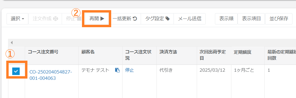 ※再開をしても与信はかかりません。すぐに与信が通るかを確認したい場合は、下記定期注文作成方法の手順で定期注文の作成をお願いします。