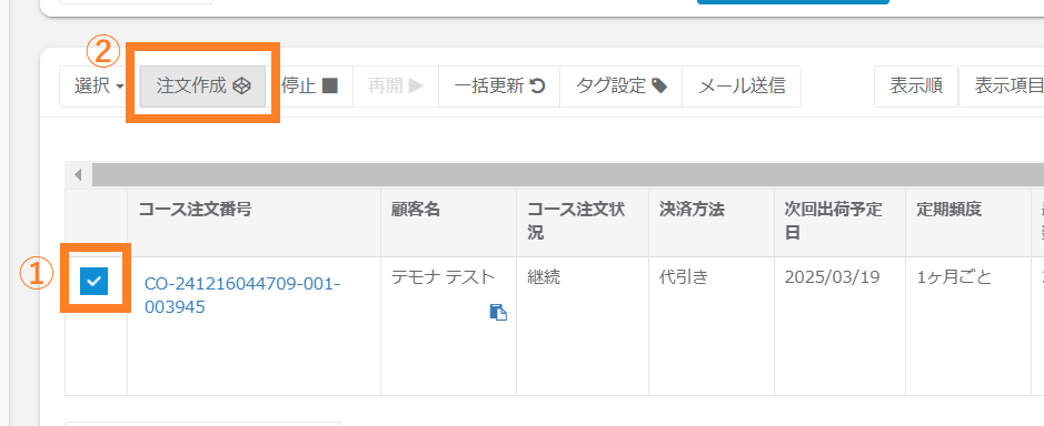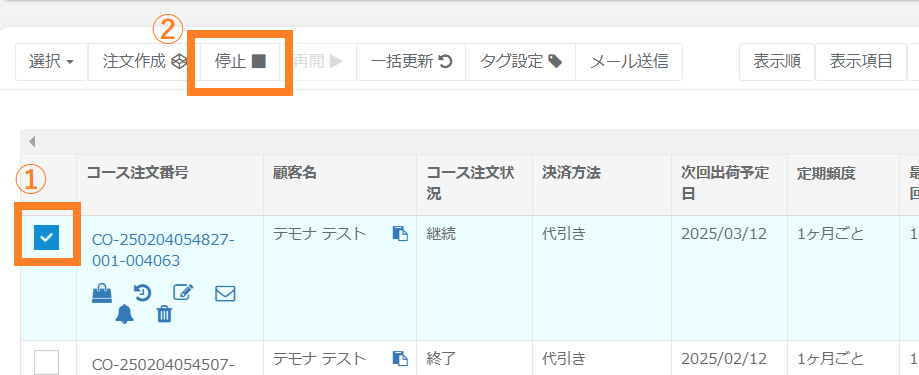 | コース注文状況 | 「継続」「停止」「終了」のステータスの中から指定してください。 | 継続 |