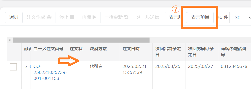④「表示項目」で定期注文マスター一覧上に表示される項目を追加できます。