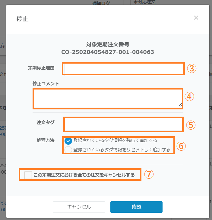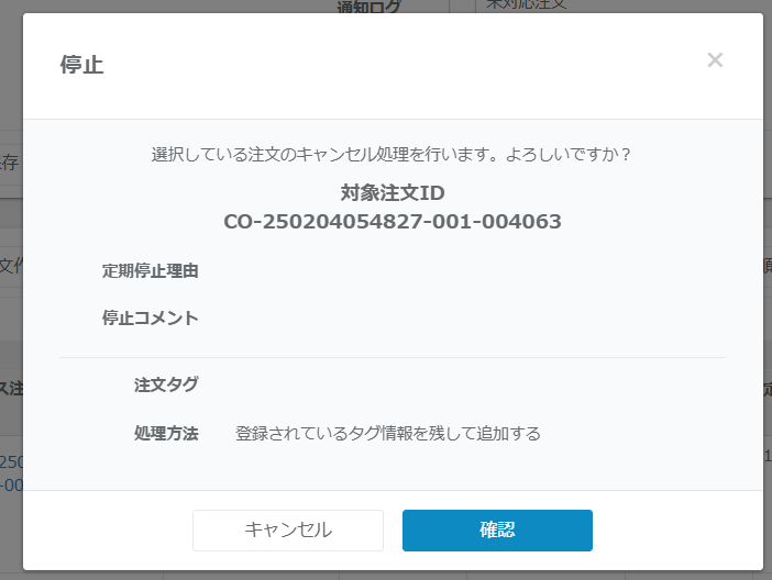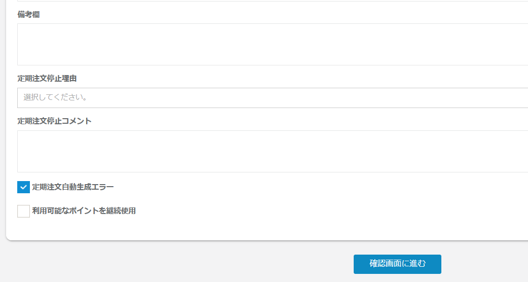 | 定期停止理由 | 定期停止理由を指定してください。 複数選択が可能です。定期停止理由機能についてはこちらをご確認ください。 | 商品があまったため |
