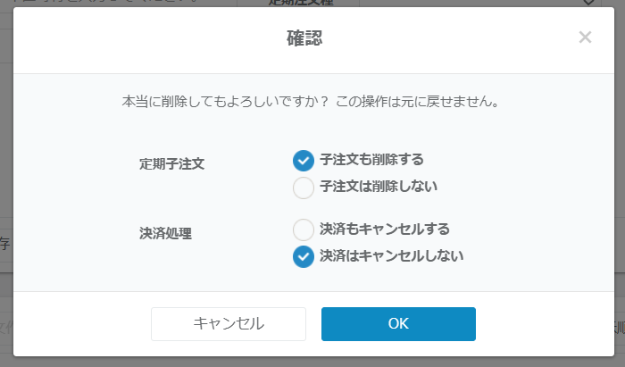 ※決済処理:決済もキャンセルするを選択すると、過去に決済を確定している子注文にも決済キャンセル処理が走りますのでご注意ください。