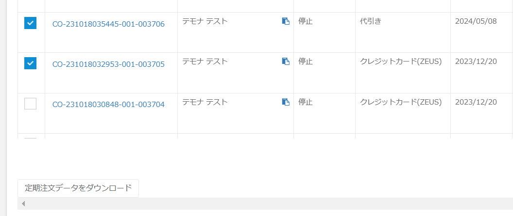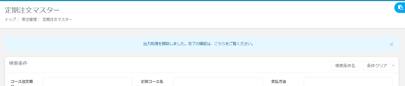 | コース注文番号 | 定期注文に割り振られる番号を指定してください。 ※完全一致での検索となります。 | CO-170516014440-000-000001 |