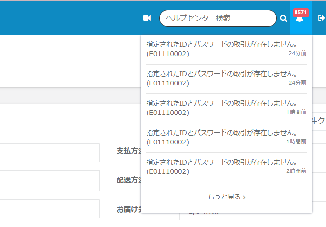 ①定期注文の自動生成時に定期注文自動生成エラーとなると、管理画面右上のベルマーク(通知)に通知されます。