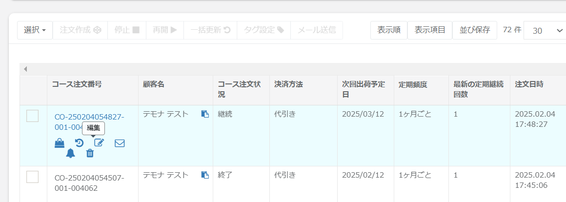 定期注文の編集をする場合はコース注文番号下「編集」ボタンをクリックしてください。