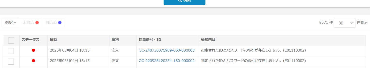 | 通知ログ | 通知「未対応」注文を検索したい場合はチェックボックスにチェックを付けます。 「対応済み」には通知ログよりご変更いただけます。 | |