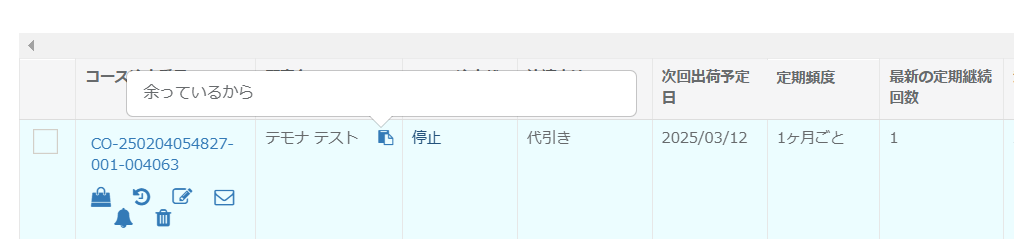 ⑩ ④で入力いただいたコメントは定期注文マスター一覧でカーソルをあわせると表示されます。
