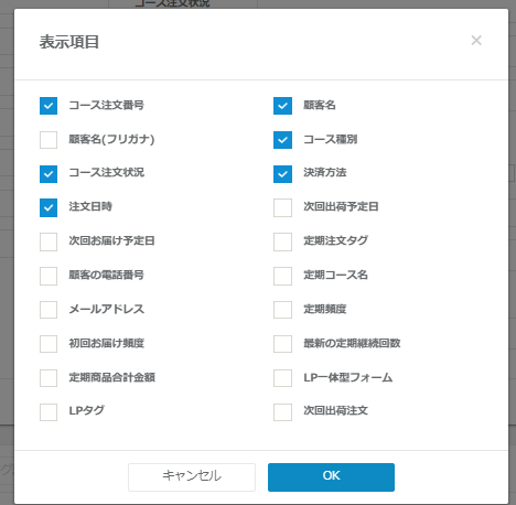 ⑤「表示項目」にて定期注文マスター一覧に追加したい項目を選択してください。