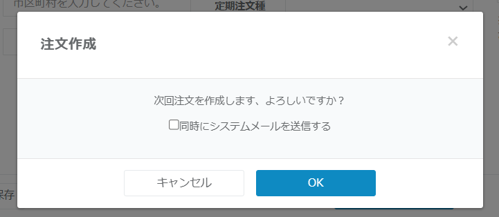 ③管理画面より定期注文を手動で作成する場合、「定期注文自動生成メール」送信の有無をご選択いただくことが可能です。メールを送信する場合は「同時にシステムメールを送信する」にチェックを入れてください。