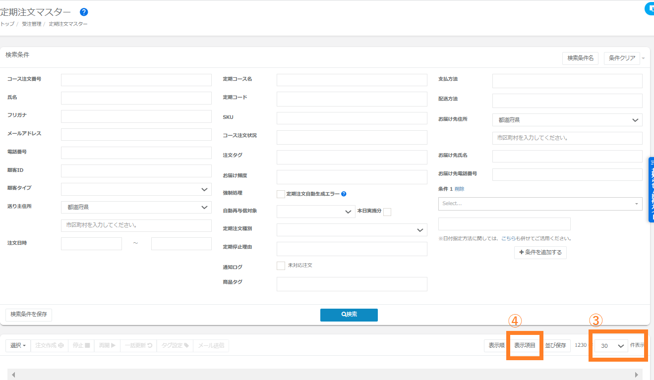 ②検索したい定期注文の条件を指定してください。「検索」ボタンをクリックしていただくと、下部に定期注文一覧が表示されます。