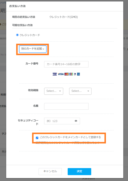 〈定期注文>該当注文の注文内容確認ボタン>お支払方法変更のボタン>別のカードを追加〉